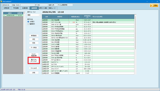 取り込み操作は非常に簡単で、血液検査の画面から[富士フイルムVETシステムズ]ボタンをクリックするだけで検査データの取り込みが完了します。